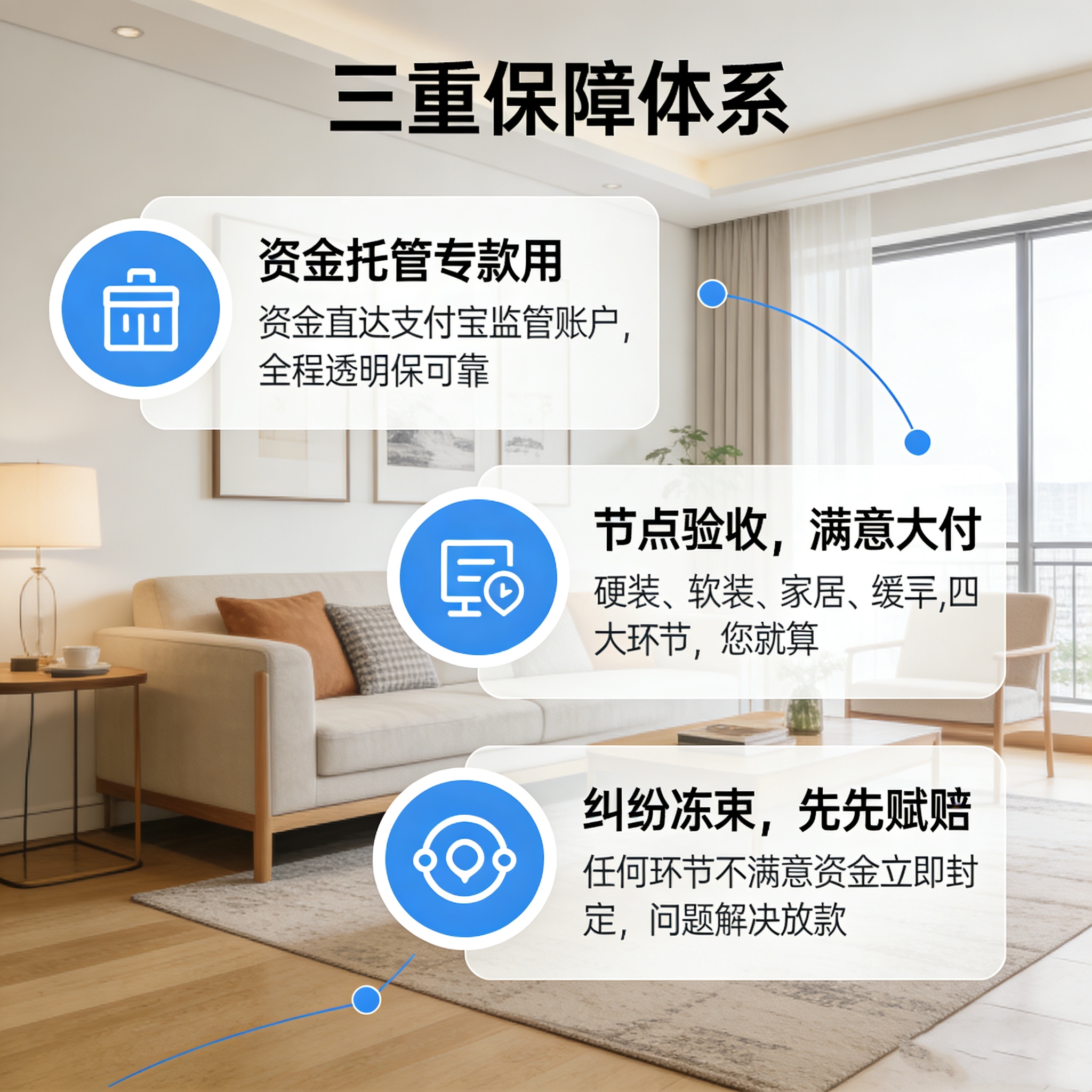 專款專用,物理隔離:您的錢,始終在您名下的支付寶賬戶中,與裝飾公司的運(yùn)營資金完全隔離。從根本上杜絕了“資金被挪用”的風(fēng)險(xiǎn)。